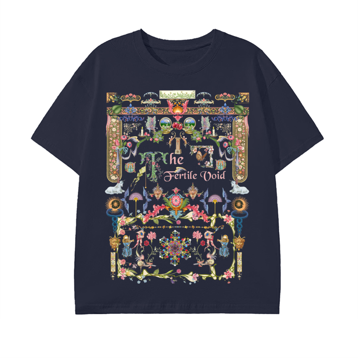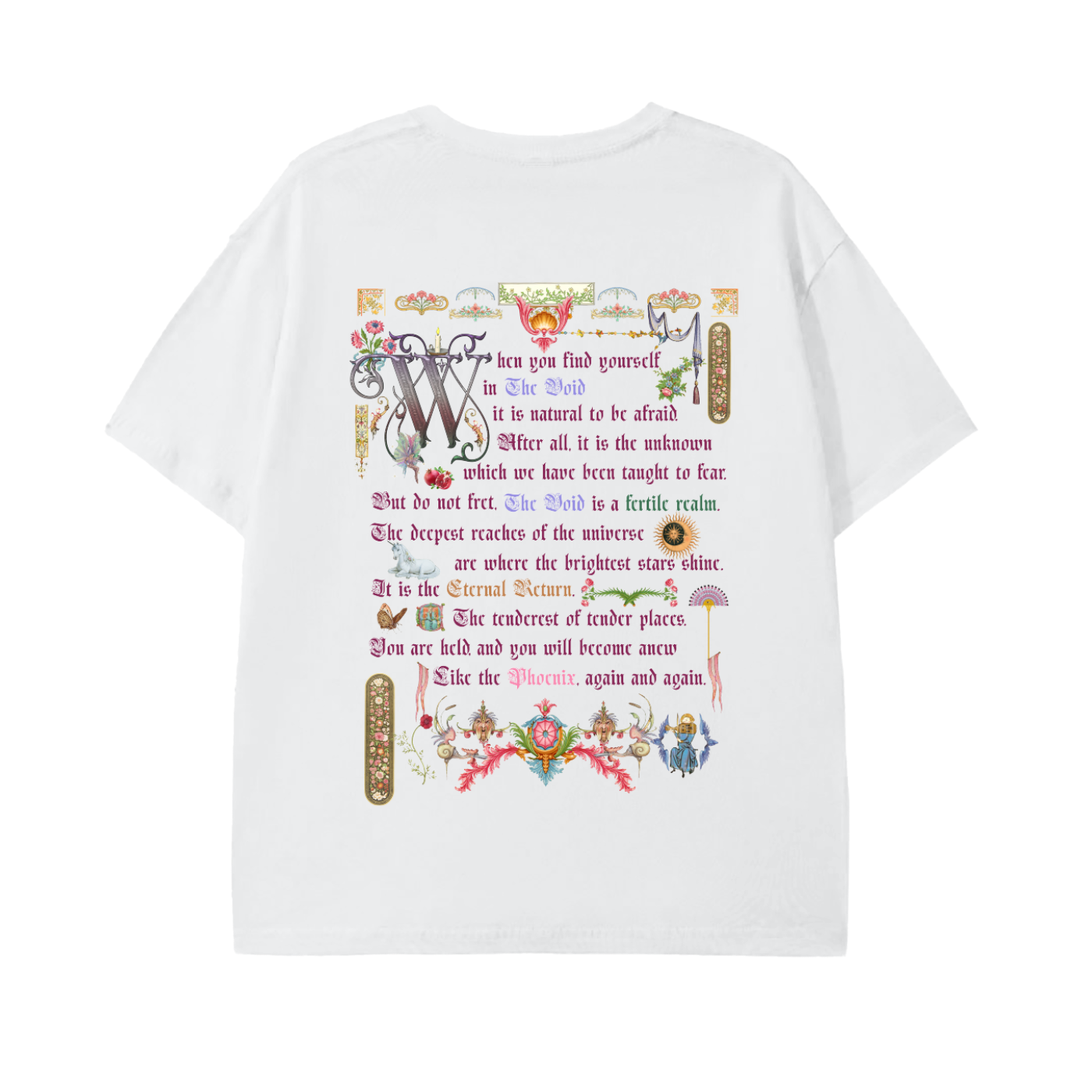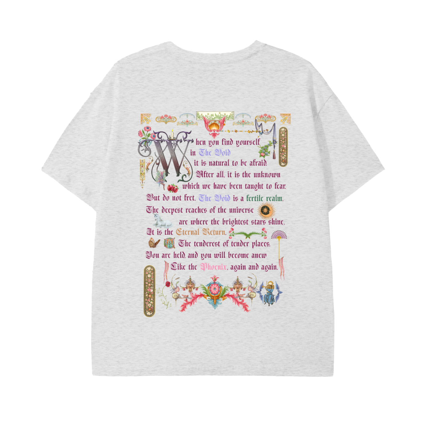 Featured in the Illuminated Magazine, this design hearkens back to ancient illuminated manuscripts from The Middle Ages, with a fae, whimsical flair. On garments both the front and back are printed.